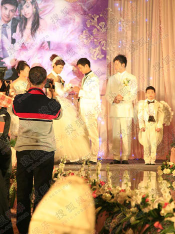 China's diving prince, 2000 and 2004 Olympic champion Tian Liang (C) and 2005 Super Girl contestant Ye Yiqian (L) exchange rings at their wedding ceremony in Shangri-La Hotel, Xi'an of Northwest China November 29, 2007. The pair's love story has been in spotlight in China since 2006. [sohu]