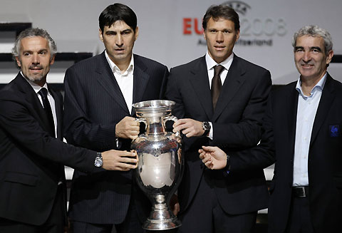 Italy's national soccer team coach Roberto Donadoni, Romania's national soccer team coach Victor Piturca, the Netherlands' national soccer team coach Marco van Basten and France's national soccer team coach Raymond Domenech (L-R) pose with the trophy after the draw for the UEFA Euro 2008 soccer finals in Lucerne December 2, 2007. Italy, Netherlands, Romania and France were drawn in Group C for the Euro 2008 finals in Austria and Switzerland. [Agencies]