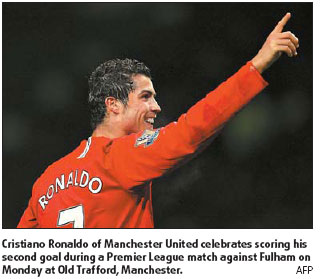 Ronaldo, who had sealed victory for United with a first-half volley and second-half header, looked on course for his first United hat trick when he bore down on Niemi with eleven minutes left to play. But the Portuguese forward fell to the ground following a rash challenge by the Fulham goalkeeper and a penalty seemed inevitable - until referee Rob Styles waved away the penalty appeals and booked Ronaldo for diving. An angry Ferguson said: "The penalty incident is a result of a perceived idea of the referee that Ronaldo dives, there is no question of that. "But in fairness to the referee in this case, the goalkeeper conned the referee. Without question, the goalkeeper got Ronaldo booked. His reaction immediately suggested that Ronaldo had dived, but it was the wrong decision. "Why would he dive? He is through, has gone round the goalkeeper and is on a hat-trick, so there is no reason to dive. It was unbelievable. He was one-on-one with the keeper and he was running at full pelt and he caught him with both hands. It was unfair that Ronaldo got booked for it. "Ronaldo is paying for his reputation, but he is nothing like that now. He is a mature and magnificent footballer and he has been unfairly treated." Ronaldo, who earned a reputation in his early days at United as a player who would often go to ground too easily, admitted he was surprised by Styles decision to book him and refuse the shouts for the penalty. Speaking after the Monday night clash, he said: "I think it was a penalty. The goalkeeper knows he touched me, but the referee made a decision and I need to respect that. "The referee was doing his job and I was doing mine. If he sees the replay, he sees that I jumped and that he touched me and in my opinion it is a penalty." With Niemi coming under fire from Ferguson for appearing to brandish an imaginary card at Styles in an effort to get Ronaldo booked, Fulham manager Lawrie Sanchez was quick to defend his goalkeeper, despite admitting that he expected the referee to award a penalty. "Antti was trying to tell the referee he had not touched Ronaldo - and he hadn't," said Sanchez. "Ronaldo jumped and sprawled. Had he jumped and gone the other side he could quite easily have scored, but he sprawled and that's why he got the booking," said the Fulham manager. "Ronaldo had a good claim for the penalty, though. The referee thought that he dived over the keeper, but I think we were fortunate to get away with it." Victory for United took it back into second spot, three points behind leaders Arsenal, but Ferguson insisted that his team can play better and be more clinical in front of goal. He said: "It was a comfortable 2-0 even though Fulham had a lot of possession, but there were too many chances missed and we were too charitable in that respect. "When we put our foot on the gas, it looked as though we could score at any time. Fulham did well keeping the ball and their strikers were lively with their ability in the air, but they didn't really threaten us."
