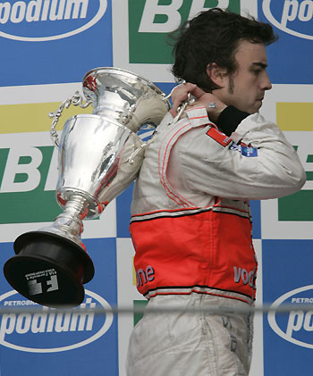 McLaren's Fernando Alonso of Spain leaves the podium with his trophy after the Brazilian Grand Prix at the Interlagos racetrack in Sao Paulo October 21, 2007. Ferrari's Kimi Raikkonen seized his first Formula One title by a single point on Sunday after a stirring victory in Brazil that shattered Lewis Hamilton's dreams. The Finn's unexpected title triumph ended 22-year-old Briton Hamilton's bid to become the youngest champion in his debut season with McLaren. [Agencies]
