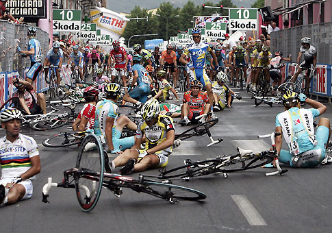 Bikers fall during the eleventh stage of the Giro d'Italia cycling race, 198 km (123 miles) from Serravalle Scrivia to Pinerolo, May 23, 2007. [Agencies]