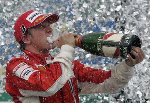 Ferrari Formula One driver Kimi Raikkonen of Finland celebrates on the podium after winning the Brazilian Grand Prix at the Interlagos racetrack in Sao Paulo October 21, 2007. Raikkonen secured his first Formula One title by a single point after a stirring victory in Brazil. His unexpected title triumph ended 22-year-old Briton Lewis Hamilton's dreams of becoming the youngest champion in his debut season with McLaren. [Agencies]