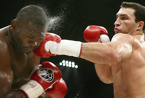 Ukrainian IBF Heavyweight boxing champion Vladimir Klitschko (R) lands a punch on U.S boxer Ray Austin before winning the IBF heavy weight World Championship title fight in Mannheim, March 10, 2007. Klitschko retained his IBF world heavyweight title by beating Austin on a technical knockout in the second round. [Agencies]