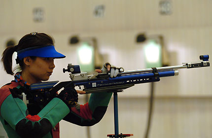 Markswomen grabbed the gold of 10-meter air rifle team event with a record-smashing 1,196 points, two points ahead of the previous world record set by Chinese team as well in the 2002 Busan Asian Games. The team was composed of Olympic gold medalist, world record holder of women's 10-meter air rifle Du Li, champion of the World Cup Bangkok and Guangzhou forts Zhao Yinghui and gold medalist of the 50-meter rifle three positions at the 2005 World Cup Finals Wu Liuxi. Du and Zhao both scored 399 points in the qualification round and Wu collected 398. In the ten-shot final, the 25-year-old Du, who is ranked world No. 1 of the discipline, stunned the audiences by hitting the bullseyes with all of the first nine shots above 10 points, including six above 10.6. Although, after a failure of the electronic screen which begot a small fuss, she finished her performance with a 9.3 point, her 1st position seemed unshakable. Du said she was regretful at the result. "I thought I was going to break the world record and suddenly felt nervous," said Du with low voice as her head drooped, "I had been aiming too long before making the shot." The girl from east China's Shandong Province, who created the world record at the 2003 Croatia World Cup with a staggering 104.9 points, was always the last of the eight finalists to open fire. In the last shot, she needed only a 10.6 point, a score seemed easy to her, to renew the record. Du's teammate Zhang Yi might have renewed the world record as well, had the record still been renewable. Zhang, 21, who carved out in the 2006 World Championships by pocketing junior gold of women's 10-meter air rifle, equaled junior world record with 400 points, or the full points, in the qualification round. The junior record, set by South Korean shooter Seo Sun Hwa in World Cup Sydney Fort, was the same as the world record shared by Chinese markswomen Du Li, Zhao Yinghui and Wu Liuxi together with some others from South Korea, Australia, Germany, Russia and India. Chinese teenage shooter Li Peijing clinched a silver with 497.8 points. In men's events, Xu Kun added another gold of men's 50-meter pistol with 662.3 points, and teenage shooters Yan Hang and Mai Jiajie split gold and silver in the junior competition of the event. Thanks to their performances, all five team golds were pocketed by Chinese team. The only gold medal Chinese lost today was the one for women's trap, in which China's Chen Li, champion of the Doha Asian Games last year, marched into the final with a leading 65 hits, but yielded to Kazakhstan markswoman Elena Struchaeva to finish the sixth. Good or bad, the scores "only belonged to a single event," said Wang Yifu, head coach of the Chinese national shooting team, "they should maintain the sharpness in the following competitions." |