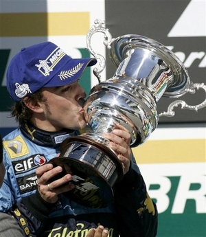 Renault's Fernando Alonso, from Spain, kisses the trophy after winning the Formula One drivers championship following the Brazilian F1 Grand Prix at the Interlagos race track in Sao Paulo, Brazil, in this Oct. 22, 2006 file photo [Agencies]