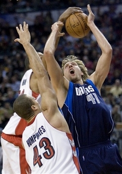 Toronto Raptors forward Jamario Moon (back) strips the ball as Dallas Mavericks forward Dirk Nowitzki (41), of Germany, drives to the hoop past Raptors forward Kris Humphries (43) during the first half of their NBA basketball game in Toronto on Wednesday Dec. 12, 2007. [Agencies]