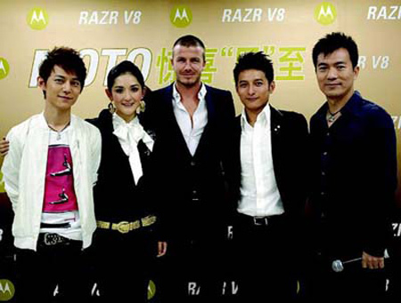 David Beckham (C) takes a photo with Chinese hosts (from L to R) He Jiong, Xie Na, Li Weijia and Huang Jianxiang at a variety show recording in Beijing on Saturday, Nov. 24, 2007. It is the very first time for him to be on a Chinese TV show. The show was aired nationwide on China's Hunan TV on Saturday evening, Dec. 15, 2007. [sina]