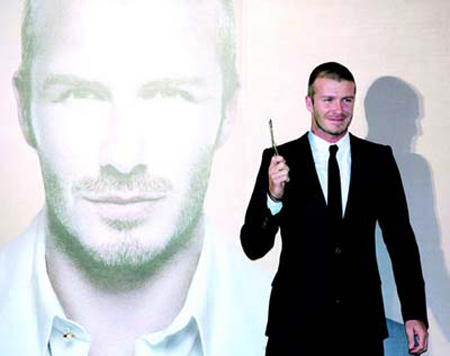 David Beckham shows Motorola's cellphone at a media conference in Beijing on Saturday, Nov. 24, 2007. [CRI]