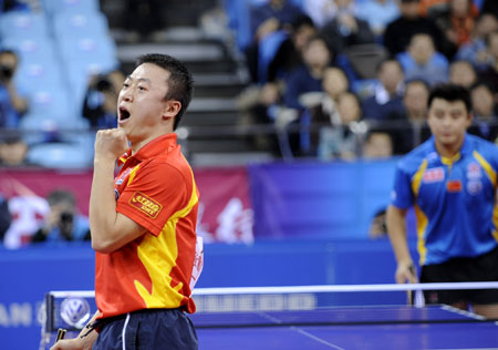 China's Ma Lin (L) celebrates a point against compatriot Wang Hao during their final game at the International Table Tennis Federation (ITTF) Pro Tour Grand Finals, one of the testing tournaments of the Beijing 2008 Olympic Games at Peking University Gymnasium December 16, 2007. Ma won the title 4-2. [Xinhua]