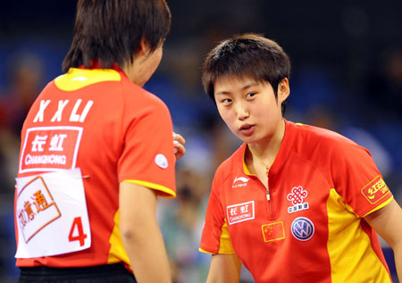 China's Guo Yue (R) and Li Xiaoxia chat before serving during their women's doubles final game against South Korea's Kim Kyung Ah and Park Mi Young at the year-ending ITTF ProTour Finals, also the last "Good Luck Beijing" Olympic test event this year Peking University Gymnasium December 16, 2007. The Chinese pair won the title 4-2. [Xinhua]