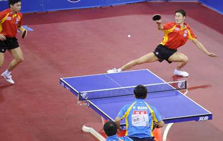 China's Wang Liqin (top right) and Chen Qi return a shot against compatriots Wang Hao and Ma Lin during their men's doubles final game at the year-ending ITTF ProTour Finals, also the last "Good Luck Beijing" Olympic test event this year at Peking University Gymnasium December 16, 2007. Wang and Ma won the title 4-1. [Xinhua]