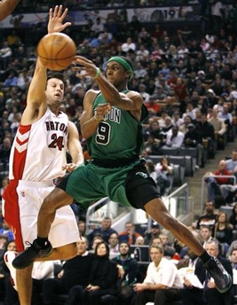 Boston Celtics guard Rajon Rondo (R) passes the ball past Toronto Raptors forward Jason Kapono (L) during the first half of their NBA basketball game in Toronto December 16, 2007. [Agencies]