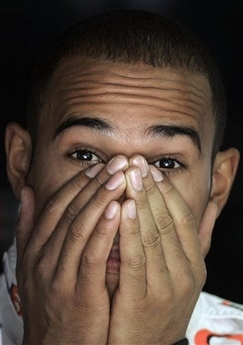 British McLaren Mercedes Formula One driver Lewis Hamilton reacts during the third timed practice session at the Montmelo racetrack near Barcelona, Spain, in this Saturday, May 12, 2007 file photo. Hamilton has had his driving licence suspended for a month after being caught speeding on a French motorway, police said on Tuesday Dec. 18, 2007. [Agencies]