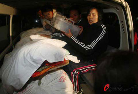 Zhou Suhong (R), China's volleyball captain helps her husband, also a volleyball player out of the ambulance as they arrive at Beijing Bo'ai Hospital December 18, 2007. Tang broke his neck and lost consciousness during warm-up exercises before a friendly match in Russia in mid-June. [sina]