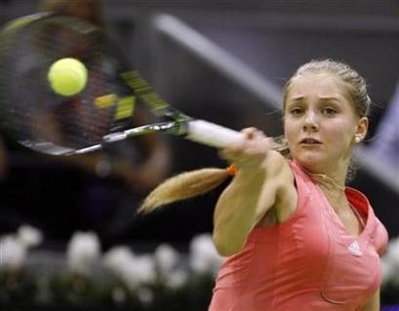 Anna Chakvetadze of Russia returns the ball during their WTA Championships tennis match in Madrid November 8, 2007. Chakvetadze escaped unharmed after several men broke into her house in southwest Moscow early on Tuesday, police said. [Agencies]