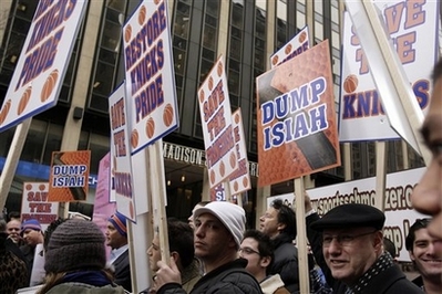 Updated: 2007-12-20 09:44 NEW YORK - New York Knicks fans angry over the team's losing streak rallied outside Madison Square Garden on Wednesday, holding aloft a giant pink slip and calling on Garden management to fire coach Isiah Thomas. Chanting "Fire Isiah! He's got to go! Good-bye!", two dozen irate fans signed the 8-by-4-foot pink placard urging Garden chief executive James L. Dolan to dump the coach, whose team is 7-17 going into Wednesday night's game with Cleveland. Among the protesters was noted civil rights lawyer and longtime Knicks fan Norman Siegel, who criticized Knicks management for ordering a fan with a "Fire Isiah" sign to leave his seat at a game Monday night. "The Knicks are trampling on what New York is all about - we're outspoken and we're zany at times," said Siegel. "But principles and values of free speech should be adopted. The Garden should rethink its policy." Thomas has been hounded by bad publicity and calls from fans to quit since October, when fired team executive Anucha Browne Sanders won a sexual harassment lawsuit against the coach and the Garden. Just before the case was to return to court to decide compensatory damages, the lawsuit was settled for $11.5 million. |