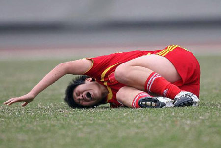 China's Ma Xiaoxu, winner of Asian Player of the Year groans after falling down during a warm-up match against New Zealand in Guangzhou of South China December 19, 2007. China won 4-0 (one New Zealand's own goal). Ma's bad injury casts doubt over her appearance in next year's Olympics. [Xinhua]