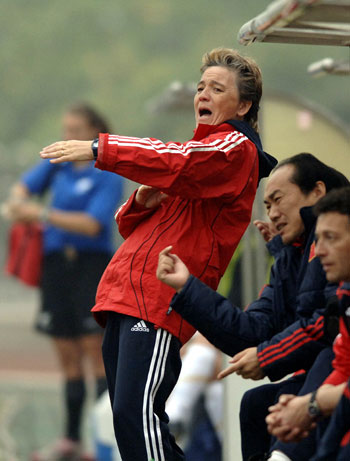 China's head coach Elizabeth Loisel of France shouts during her side's warn-up match against New Zealand in Guangzhou of South China December 19, 2007. China won 4-0 (one New Zealand's own goal). Striker Ma Xiaoxu got badly injured, which casts doubt over her appearance in next year's Olympics. [Xinhua]