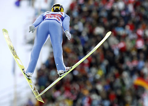 Austria's Thomas Morgenstern soars through the air during the first jump of the individual large hill ski jumping World Cup in Engelberg December 23, 2007. Switzerland's Andreas Kuettel won the competition ahead of Austria's Gregor Schlierenzauer and third placed Austria's Thomas Morgenstern. [Agencies]