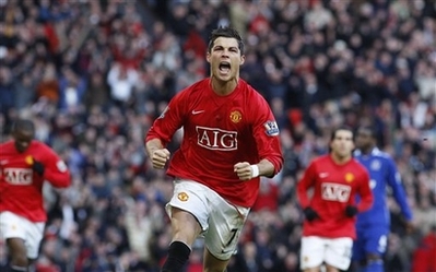 Manchester United's Cristiano Ronaldo celebrates after scoring the winner against Everton during their English Premier League soccer match at Old Trafford Stadium, Manchester, England, Sunday Dec. 23, 2007. [Agencies]