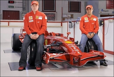 Ferrari drivers Kimi Raikkonen (L) and Felipe Massa sit alongside the new Ferrari F2008 racecar after it was unveiled in Maranello, Italy. Raikkonen believes that his thrilling, last-gap Formula One triumph in 2007 can provide the platform for a title repeat this season. [Agencies]