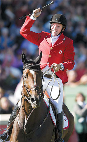 Canada's Eric Lamaze celebrates on his horse, Hickstead, after winning the CN International show-jumping competition at the Spruce Meadows Masters in Calgary, Alberta, on September 9, 2007. [Agencies]