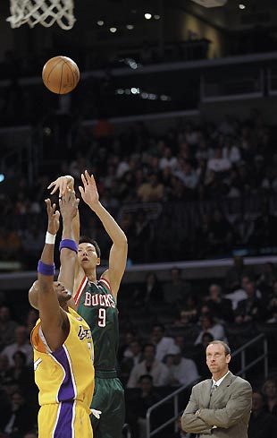 Yi Jianlian (R) of China has 13 points and 6 rebounds in Milwaukee Buck's 110-105 loss to the Los Angeles lakers on January 11, 2008. [Xinhua]