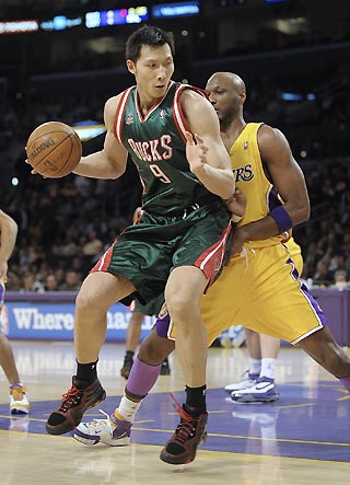 Yi Jianlian (L) of China has 13 points and 6 rebounds in Milwaukee Buck's 110-105 loss to the Los Angeles lakers on January 11, 2008. [Xinhua]
