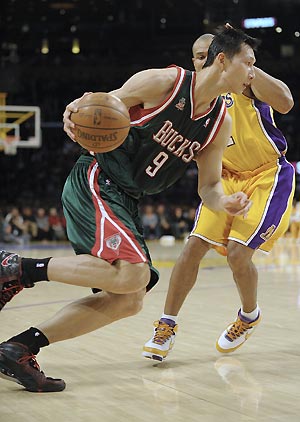 Yi Jianlian (L) of China has 13 points and 6 rebounds in Milwaukee Buck's 110-105 loss to the Los Angeles lakers on January 11, 2008. [Xinhua]