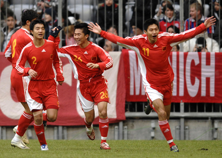 Chinese player Zhu Ting(R) celebrates after his goal during the friendly soccer match with Bayern Munich in Munich, January 12, 2008. [Xinhua]