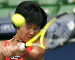 China's Yuan Meng plays a return to Japan's Ai Sugiyama during their first round match at the Japan Open tennis championships in Tokyo October 2, 2007. [Agencies]