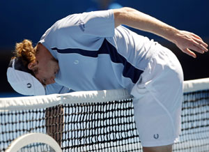 Britain's Andy Murray reaches over the net during his match against France's Jo-Wilfried Tsonga during their match at the Australian Open tennis tournament at Melbourne Park, January 14, 2008. [Agencies]