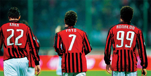 From left: AC Milan's Brazilian midfielder Kaka, Brazilian forward Pato and Brazilian forward Ronaldo, the new AC Milan Brazilian attacking triumverate, nicknamed by Italian newspapers "Ka-Pa-Ro" (Kaka, Pato and Ronaldo), walk on the pitch during their Italian Serie A soccer match against Napoli on Sunday at San Siro stadium in Milan. [Agencies]
