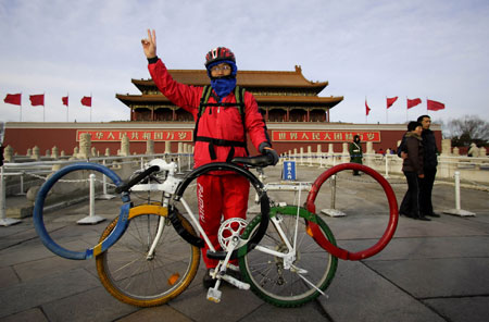 Meng Jie, a sports devotee from Heilongjiang Province, poses with his self-designed Olympic ring-shaped bicycle on the Tian 'anmen Square after arriving in Beijing on the bike January 22, 2008. Meng left Yinchuan of Northwest China's Ningxia Hui Autonomous Region at the end of last October for his nationwide tour to promote Olympic spirit. [Xinhua]