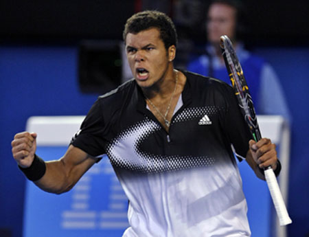 France's Jo-Wilfried pumps his fist during his men's final match against Serbia's Novak Djokovic at the Australian Open tennis tournament in Melbourne January 27, 2008. Djokovic captured his first Grand Slam event title 4-6, 6-4, 6-3, 7-6 (7-2). [Agencies]