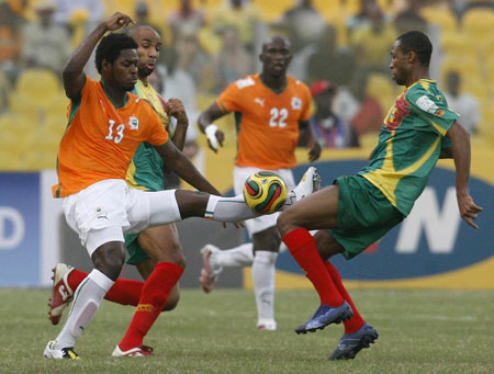 Ivory Coast's Christian Koffi Ndri (L) tries to control the ball while under pressure from Mali's Seydou Keita (R) in their African Nations Cup Group B soccer match in Accra January 29, 2008. [Agencies]