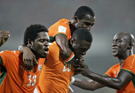 Ivory Coast's Constant Djakpa (bottom C) celebrates with teammates Christian Koffi Ndri (13), Siaka Tiene (top C) and Marc Zoro (R) after he scored their third goal against Mali in their African Nations Cup Group B soccer match in Accra January 29, 2008. [Agencies]