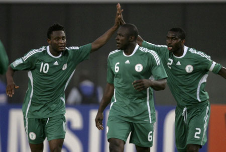 John Obi Mikel of Nigeria (L) celebrates his goal against Benin with teammates Joseph Yobo (R) and Danny Shittu (C) during their African Nations Cup Group B soccer match in Sekondi January 29, 2008. [Agencies]