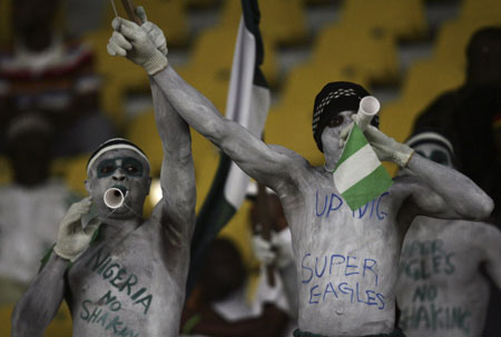 Supporters of Nigeria cheer after the team scored their second goal against Benin during their African Nations Cup Group B soccer match in Sekondi January 29, 2008. [Agencies]