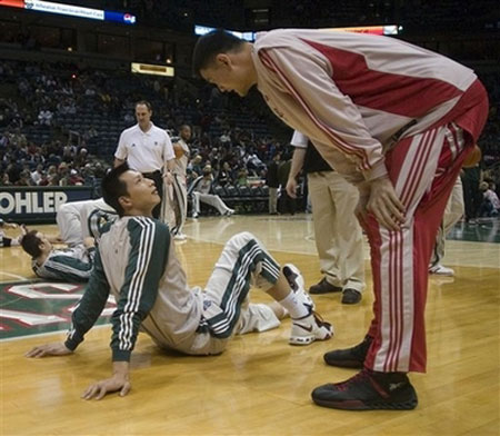 Milwaukee Bucks' Yi Jianlian, left, talks with Houston Rockets' Yao Ming, during warm-ups before the basketball game, Saturday Feb. 2, 2008 in Milwaukee. [Agencies]