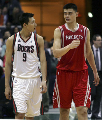 Milwaukee Bucks forward Yi Jianlian (9) and Houston Rockets center Yao Ming (11), both from China, talk as they walk off the court following Houston's 91 83 win over the Bucks in NBA action in Milwaukee, Wisconsin February 2, 2008. [Agencies]