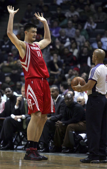 Houston Rockets center Yao Ming (11) protests to referee Orlandis Poole (R) after being charged with fouling a Milwaukee Bucks player in the act of shooting in the second half during NBA action in Milwaukee, Wisconsin February 2, 2008. [Agencies]
