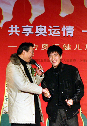 China's world and Olympic champion Liu Xiang (Right) shakes hands with an official during a communal activity with the theme of "Cheering for Olympic athletes" in Shanghai February 4, 2008. The 24-year-old said he felt no pressure at all during the run-up to the Olympics in August because he has already got an Olympic gold medal under his belt. [Xinhua]