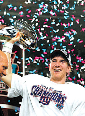 But its defense couldn't stop a final, frantic 12-play, 83-yard drive that featured a spectacular leaping catch by David Tyree, who had scored New York's first touchdown on the opening drive of the fourth quarter. New York Giants quarterback Eli Manning holds up the Super Bowl trophy after beating the New England Patriots in the NFL's Super Bowl XLII in Glendale, Arizona, on Sunday. Reuters "It's the greatest feeling in professional sports," Burress said before bursting into tears. "That's a position you want to be in," said Manning, who followed older brother Peyton's Most Valuable Player performance last year with one of his own. "You can't write a better script. There were so many big plays on that drive." The Patriots were done in not so much by the pressure of the first unbeaten season in 35 years as by the pressure of a smothering Giants pass rush. Tom Brady, the league's MVP and winner of his first three Super Bowl, was sacked five times, hurried a dozen more and at one point wound up on his knees, his hands on his hips following one of many poor throws. Hardly a familiar position for the record-setting Patriots and their megastar quarterback. And a totally strange outcome for a team that seemed destined for historic glory. "They played well," Patriots coach Bill Belichick said. "They made some plays. We made some plays. They just made a few more. We played as hard as we could. We just couldn't make enough plays." Oddly, it was a loss to the Patriots that sparked New York's stunning run to its third Super Bowl and sixth NFL title. New England won 38-35 in Week 17 as the Patriots became the first team since the 1972 Miami Dolphins to go spotless through the regular season. But by playing hard in a meaningless game for them, the Giants gained something of a swagger. Their growing confidence carried them through playoff victories at Tampa, Dallas and Green Bay, and then past the mightiest opponent of all. Not that the Patriots were very mighty this day. They even conceded with 1 second on the clock as coach Bill Belichick ran across the field to shake the hand of jubilant Giants coach Tom Coughlin, then headed to the locker room, ignoring the final kneeldown. That it was Manning taking the knee was stunning. Peyton's kid brother not only matched his sibling's achievement of last year with the Indianapolis Colts, but he showed the brilliant precision late in the game usually associated with, well, Brady. Peyton Manning was seen in a luxury box jumping up and pumping both fists when Burress, who didn't practice all week because of injuries, caught the winning score. "We just hung in there on offense, kept executing," said Burress, who wasn't far off on the 23-17 prediction he made a few days ago. "It came down to one play and we made it." The Giants became the first NFC wild card team to win a Super Bowl; four AFC teams have done it. They also are the second team in three years to play nothing but away games and come away with the big prize; Pittsburgh did after the 2005 season. Until the frantic fourth quarter, the only scoring came on the game's first two drives. The Giants did almost exactly what they sought with the opening kickoff, using up nearly 10 minutes to go 63 yards. Almost exactly, but not quite, because they settled for a 32-yard field goal after converting four third downs on the 16-play series. The 9:59 drive was the longest in Super Bowl history. |