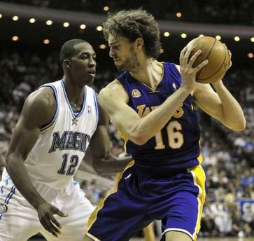Los Angeles Lakers center Pau Gasol (R) of Spain, starts his move around Orlando Magic center Dwight Howard during first-half NBA basketball action against the Orlando Magic in Orlando, Florida February 8, 2008. [Agencies]