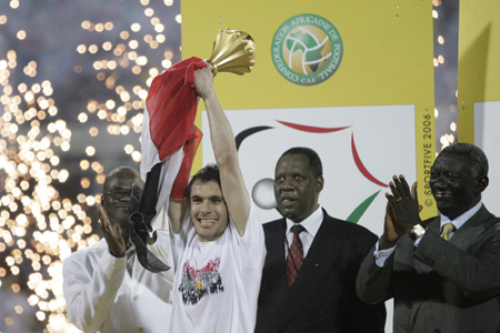 Egypt's captain Ahmed Hassan holds the trophy after they beat Cameroon, as Ghana's President John Kufuor (R) and African soccer executives applaud in the African Nations Cup soccer final in Accra February 10, 2008. [Agencies]