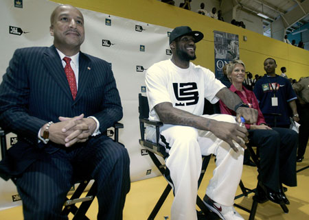 NBA All-Star LeBron James of the Cleveland Cavaliers (R) along with New Orleans Mayor Ray Nagin (L) prepares to address local children during a ceremony held by LeBron James Family Foundation which installed a new playground at the St. Bernard Recreation Center in New Orleans, Louisiana February 14, 2008. State Farm is sponsoring the inaugural playground installation at the St. Bernard Recreation Center. [Agencies]