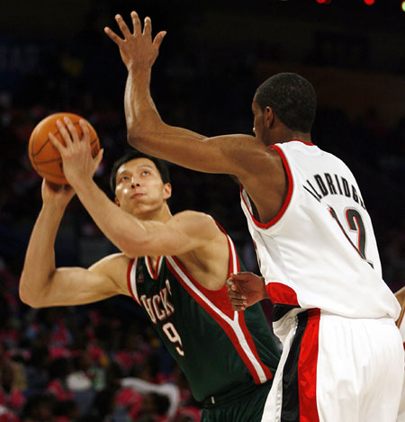Milwaukee Bucks forward Yi Jianlian (L) of China is guarded by LaMarcus Aldridge (R) of the Portland Trailblazers during the NBA Rookie Challenge game part of the National Basketball Association All-Star weekend in New Orleans, Louisiana February 15, 2008. [Agencies]