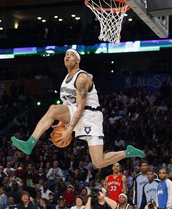 Minnesota Timberwolves Gerald Green performs a dunk in his socks during the NBA All-Star basketball Slam Dunk competition in New Orleans, Louisiana February 16, 2008. [Agencies]