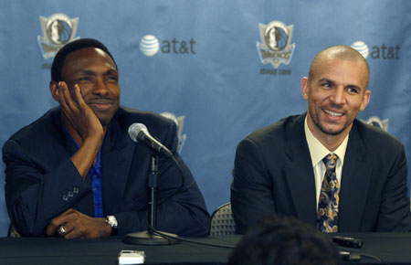 Dallas Mavericks head coach Avery Johnson (L) and guard Jason Kidd listen to a reporter's question at a news conference to announce the trade from the New Jersey Nets in Dallas, Texas February 19, 2008. [Agencies]